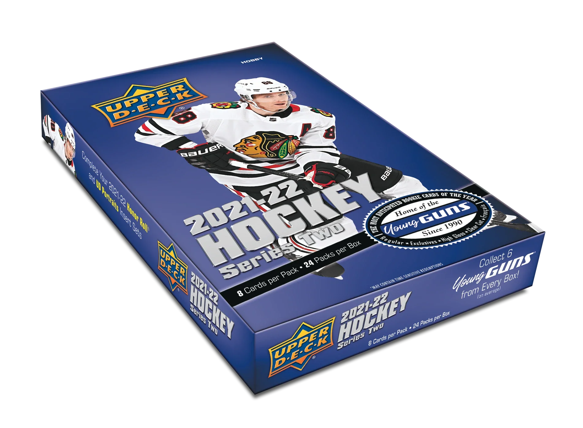 • Series 2 features the next 250 cards of the 2021-22 Upper Deck Base Set. Collect new veteran and Young Guns® cards – the most anticipated rookie cards of the year! Look for six of these cherished rookie cards in every box, on average.